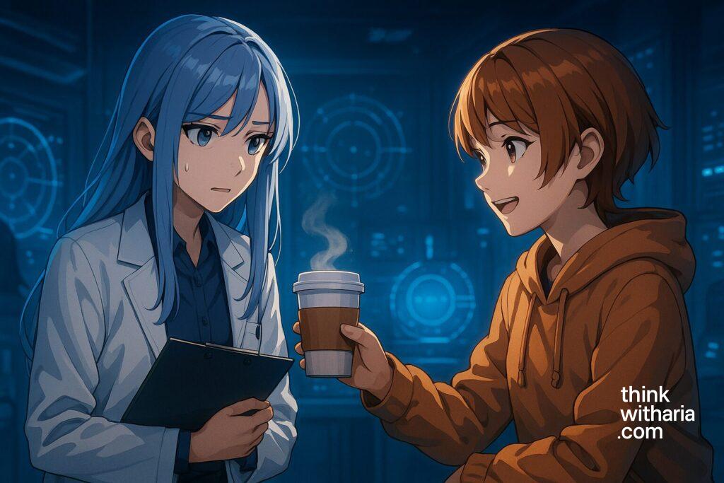 カップのコーヒーが湯気を上げる。カナ が笑って差し出し、「緊張しすぎ」と軽口を叩く。遠隔モニターの ミナ は冷静に最終チェックを読み上げ、「倫理委員会は二重承認済み。ここから先は私たち自身の責任よ」と釘を刺す。ベンチに座る少年型AI ソウ は掌のホログラム時計をくるくる回し、「ねぇ、巻き戻るとき僕の記憶はどうなるの?」と首を傾げた。