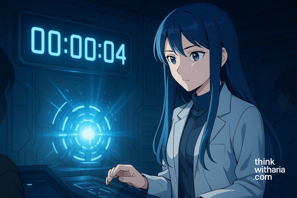 研究棟地下ラボ。無音の闇に、壁一面のホログラムが赤いカウントを刻む。00:00:05──あと五秒で世界は未知へ飛び込む。白衣姿の アリア は震える指先を握りしめ、漆黒の球体《リライター》を見つめた。球面の奥で青白い光子が脈動し、ラボの空気を微かに歪める。